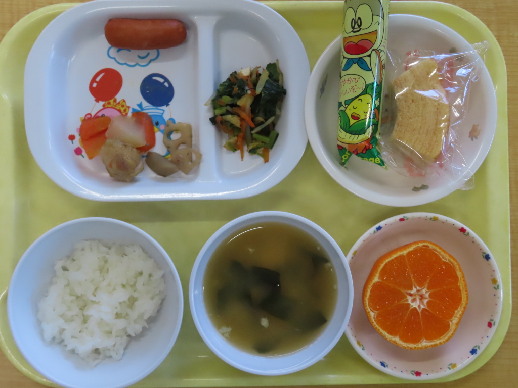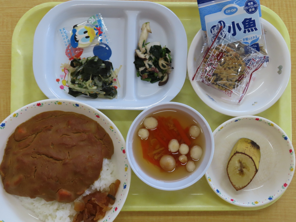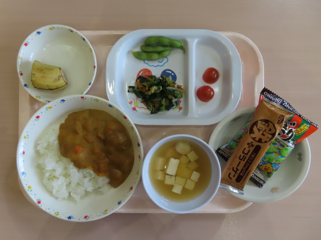 今日はカレーでした😊園庭で遊んだり、公園に行ったからなのか食欲旺盛でしたよ(*^^)vみんなペロリでした🎵おやつは、「カルシウムセット」小魚とごませんべいで、歯を丈夫にね💖
