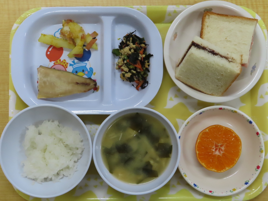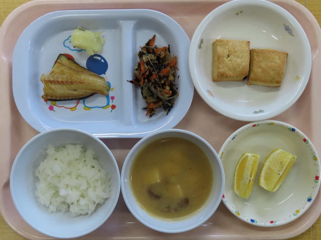 今日のお魚は「ほっけ」でした(*´ω`)ほっけは、焼く前にお酒を少しふると身がふっくらするみたいですよ~☆彡おやつのスコーンはプレーン味とチョコ味でした☺どちらが好きだったかお家で聞いてみてくださいね😊