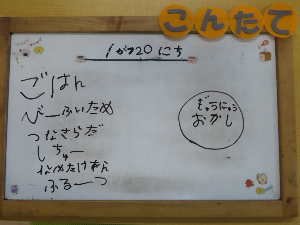 今日から年長さんに献立を書いてもらっています⭐嫌がることもなく書いてくれるので助かります( ´艸`)今日は肉じゃが☆彡👩「肉じゃがおかわりないの?」と言われたので、「おかわり出せたら出すね!」と答えると、「肉じゃが好きだからおかわりほしい」と言ってました💓おかわりを出すとしっかり完食してきてくれましたよ😊