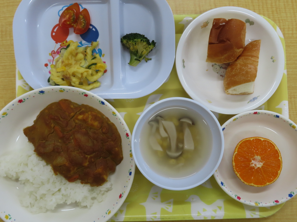 子どもたちの大好きなカレー💛今日はお肉と豆腐を入れました(*'▽')午後のおやつのパンは、2種類出しました⭐何の味だったか聞いてみてください😊
