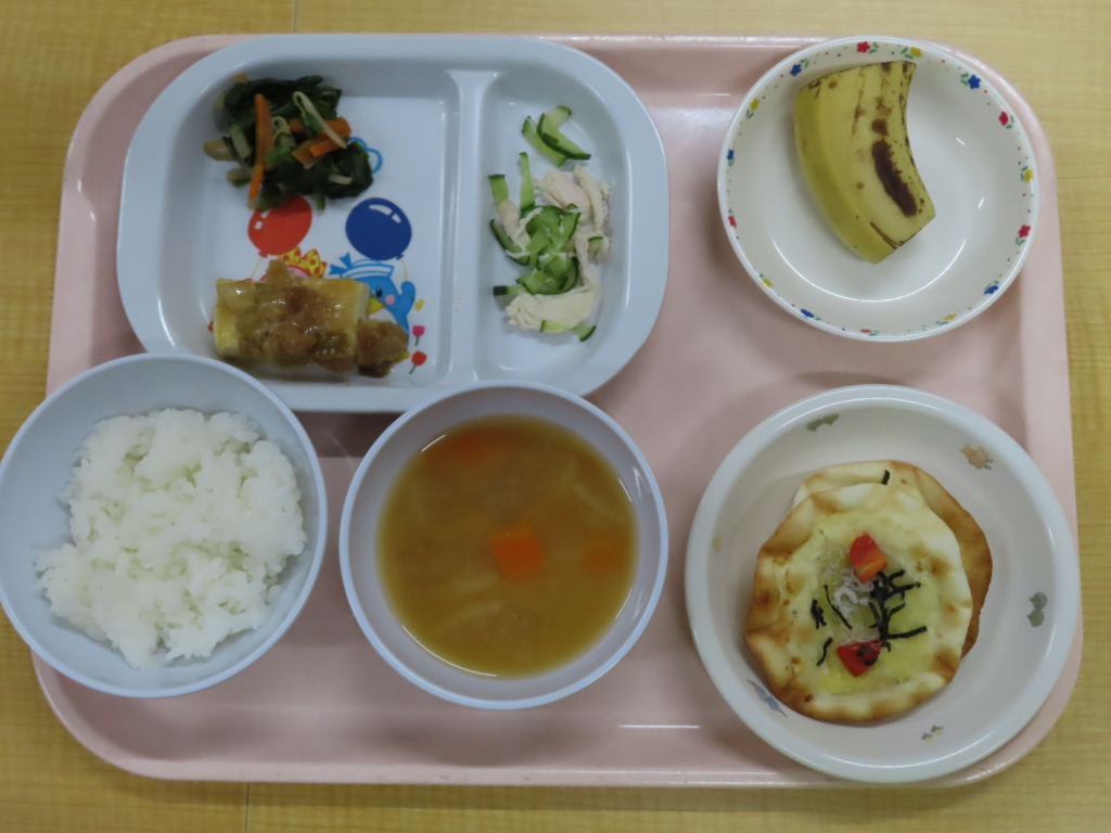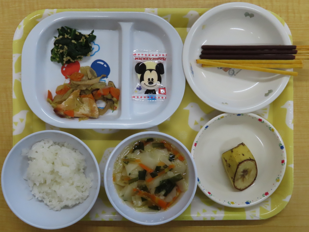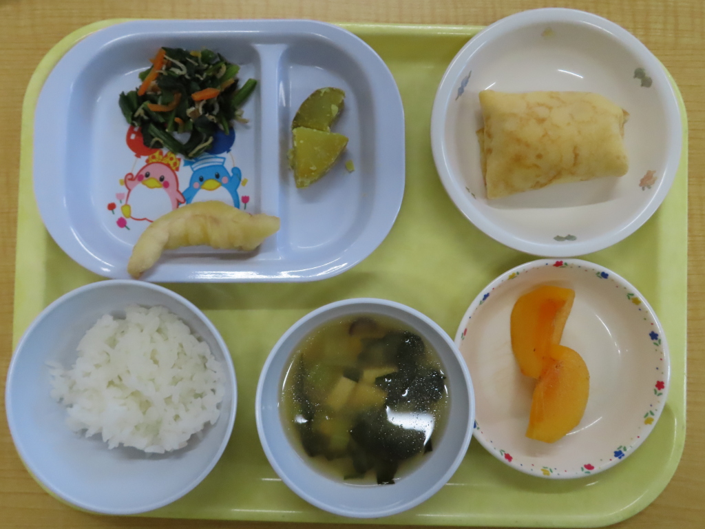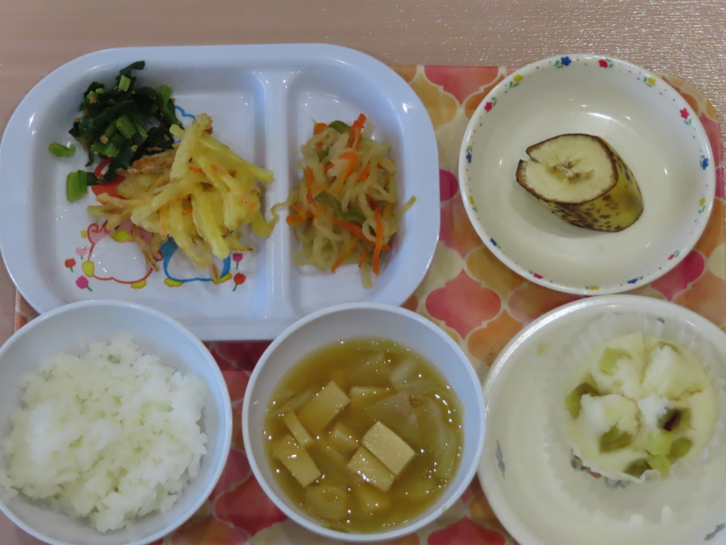 今日の副菜は、小松菜の鮭フレーク和え!さらっとごま油を加えることで、風味が加わっておいしく仕上がります♪玉ねぎ、にんじん、さつまいも、シラスを使ったかき揚げ。テーブルに並べるときにスルっと床へ滑り落ちてしまい・・・ほんのり涙を浮かべるすみれ組のお友達😢ですが、今日はおかわりもあったので、しっかり食べることが出来ましたよ💕