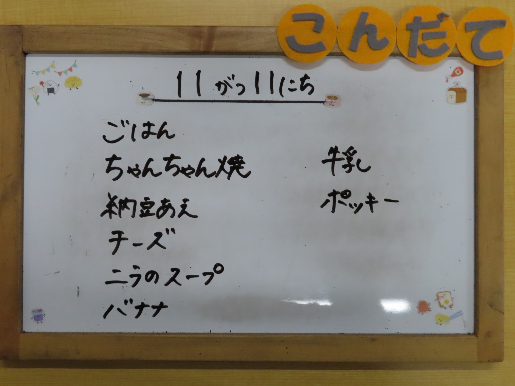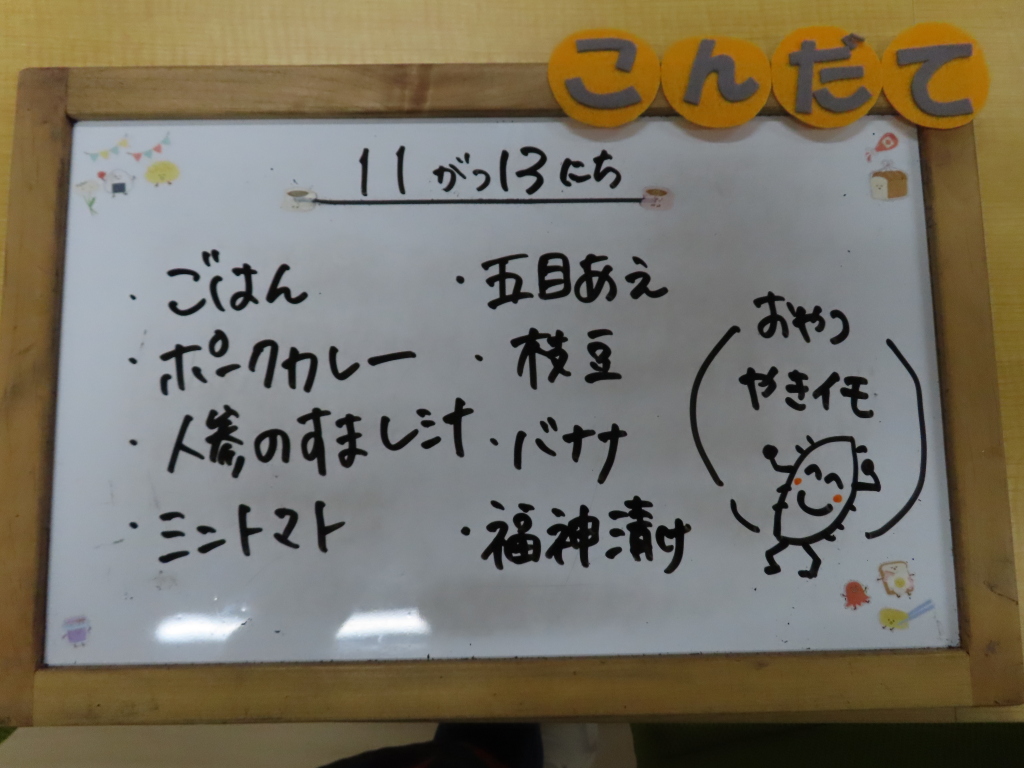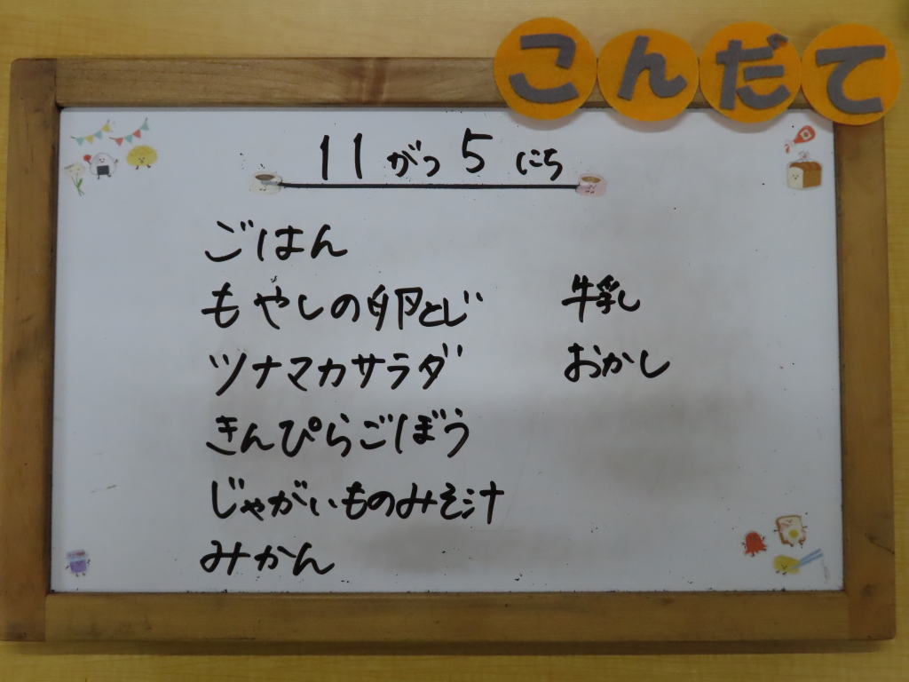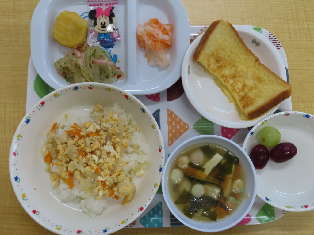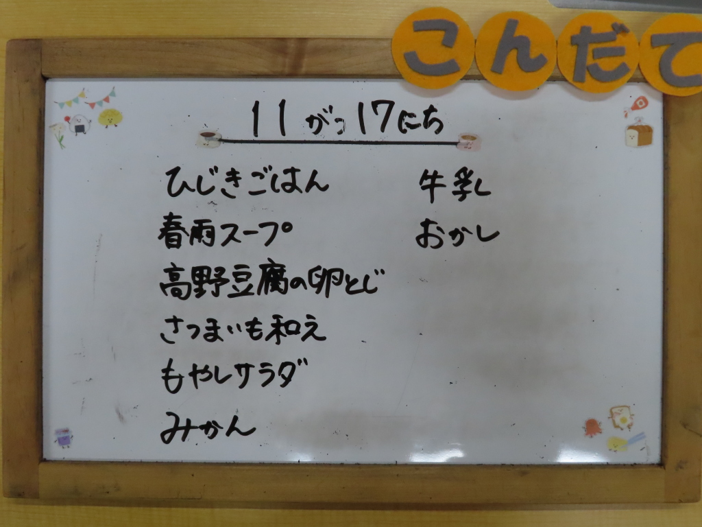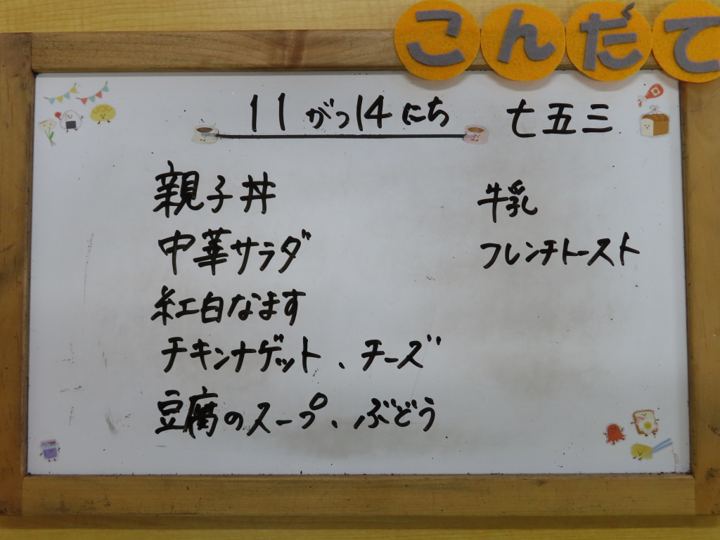 今日は七五三でした🎵久しぶりに平日に親子丼♪紅白なますを苦手と感じていた子もいたようですが、頑張って食べてくれたようです(*´▽`*)おやつのフレンチトーストも、おかわりもペロリでした😊市内ではインフルエンザが流行っているようです!たくさん食べて元気に過ごしたいですね💕
