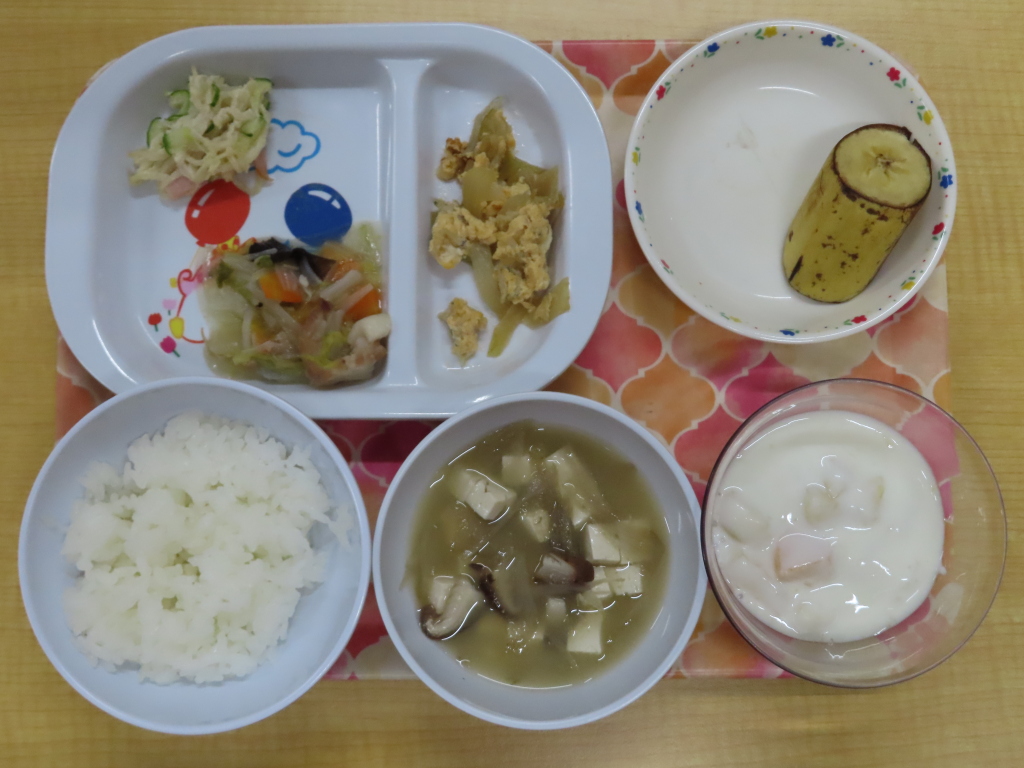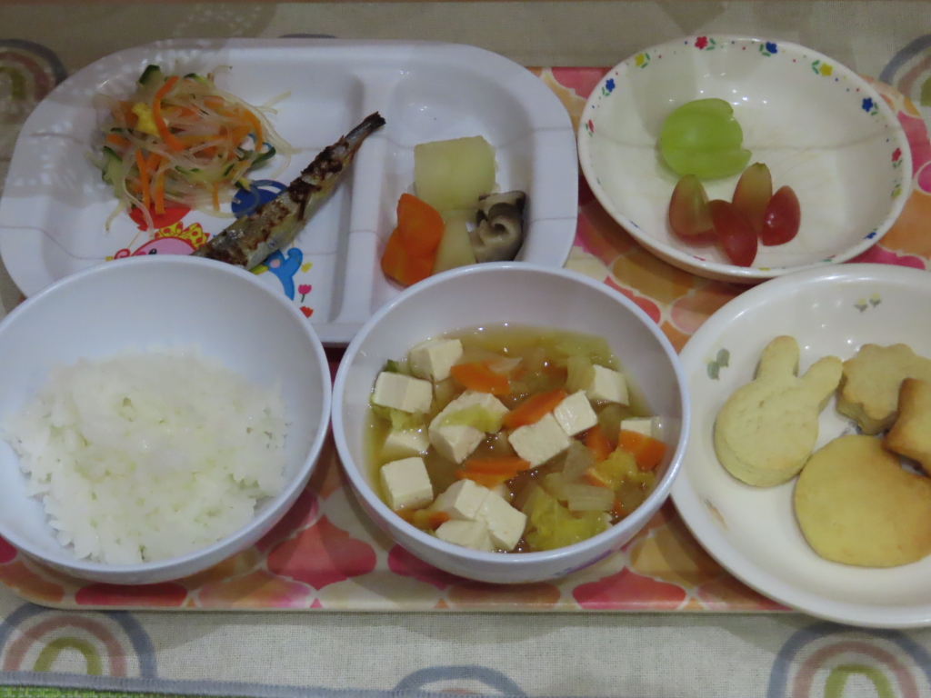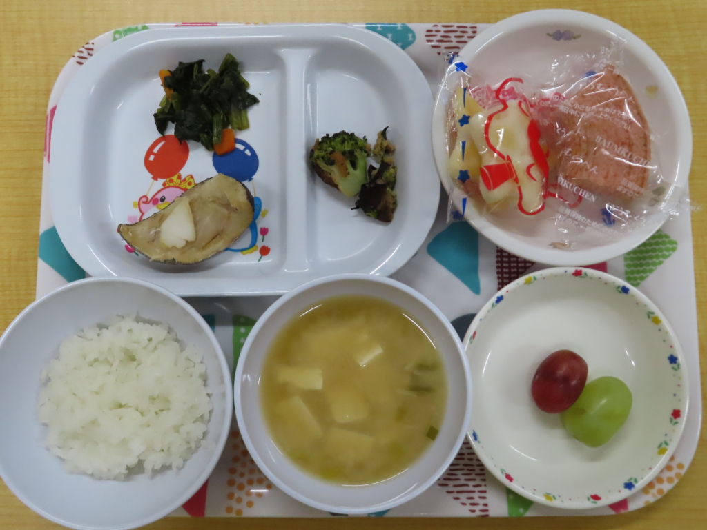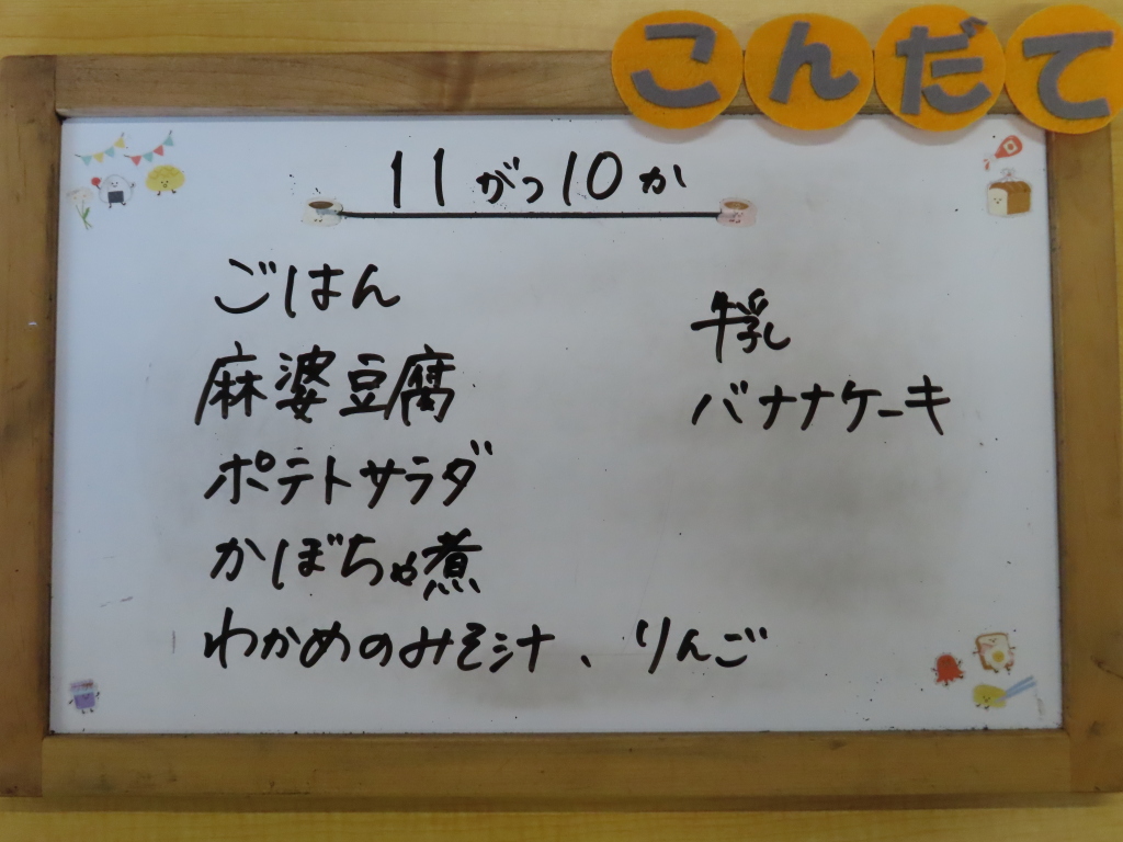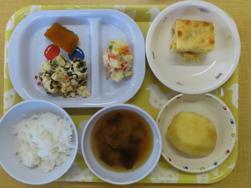 かぼちゃ煮のかぼちゃは保育園で収穫したものでした🎵甘いかぼちゃだったので、子どもたちはすぐに食べちゃいました(*'▽')午後のおやつのバナナケーキはいつもよりふっくら作りました💕食べ応えがあったようです★今日から、さくら組さんが自分たちで、ごはん・みそ汁を盛り付けしています。自分の食べられる量を自分で盛り付けていますよ!