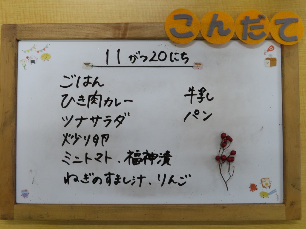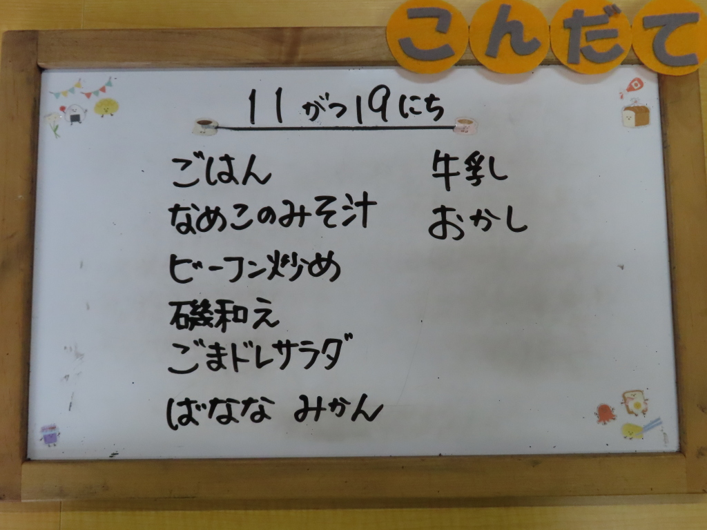 日中も冷える日が増えてきましたね。11月は、7日が秋の遠足でお弁当の日になります🍱お弁当の日は、朝から食べるのが楽しみでそわそわするこども達🥰14日は七五三、21日は誕生会(和食の日)と行事が盛りだくさんです♪ どんどん寒くなるので、三食しっかりご飯を食べて冬に向けて身体づくりをしていきたいですね☃☃☃